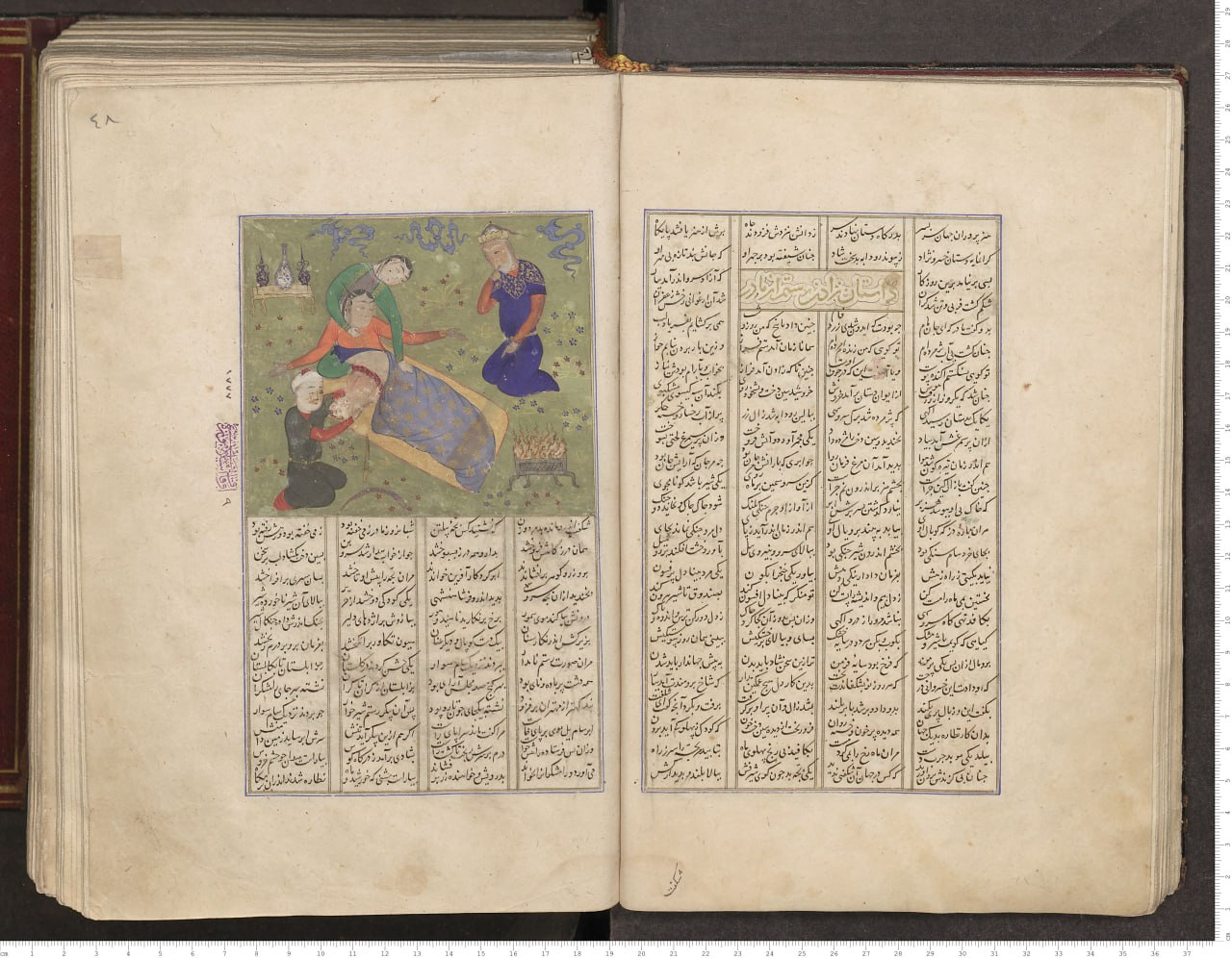 Above Rudaba’s head, the princess’s mother Sindokht is portrayed supporting her daughter.