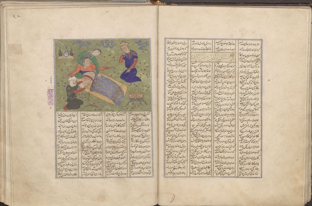 In the left part of the miniature, next to the woman in labor, the healer extracts the baby from Rudaba’s abdomen by Caesarian section.