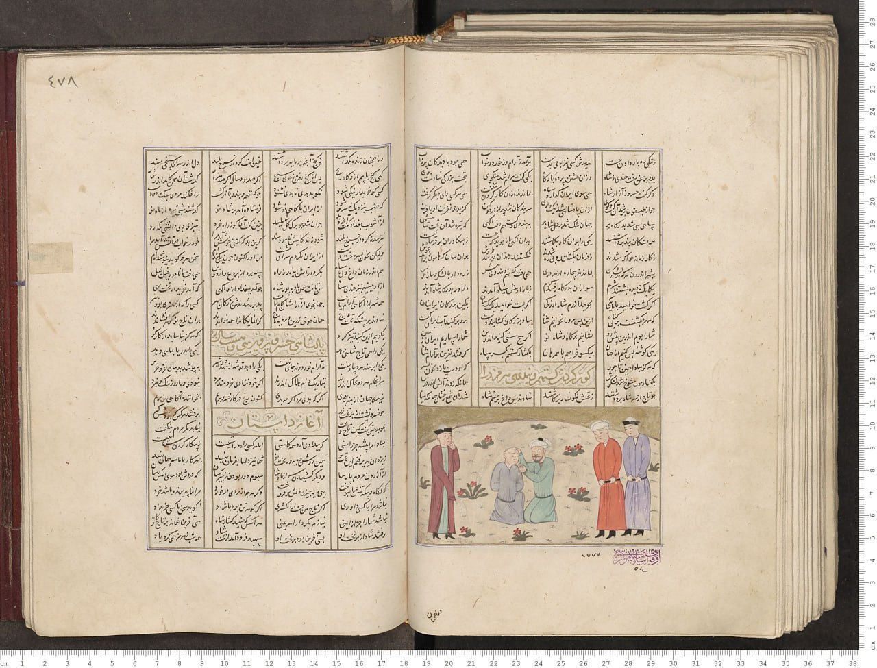“Iskandarning Hindiston tabibini sinagani” syujetiga bag‘ishlangan miniatyura o‘ng sahifaning pastki qismi –  matn tagida joylashgan.