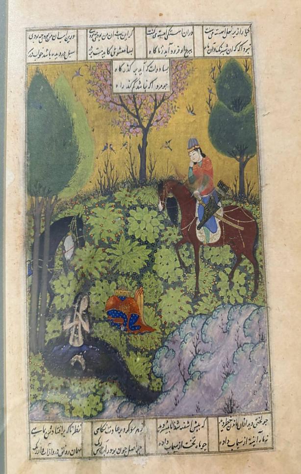 Yashil adir fonida ajralib turuvchi qizil va feruza rangli kiyimda jigarrang ot ustida o‘tirgan Xusrav o‘ng qo‘lini labiga tekkizgancha Shiringa hayratda boqmoqda. Oltin osmon fonida yashil sarv daraxtlarining quyuq shox-shabbalari va pushtirang gullagan daraxt ko‘rinadi.