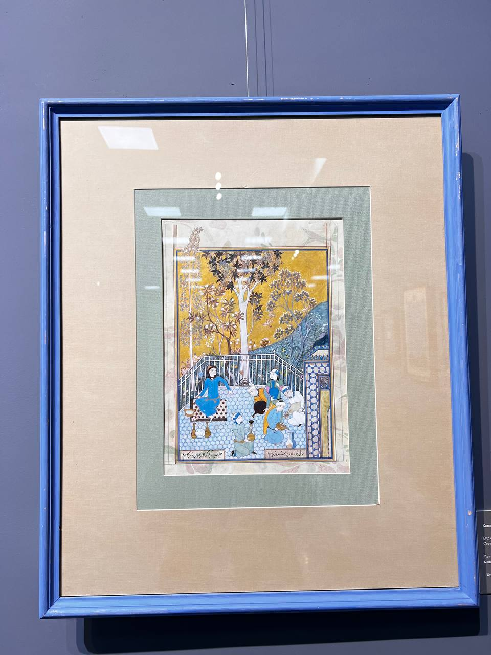Niyozali Xolmatov nusxa uchun Behzod diptixining chap qismini tanladi, unda olti nafar erkak figurasi kichkina ayvonda tasvirlangan.
