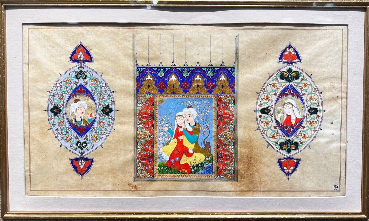 Sevishganlarning tasviri o‘rta asr Sharq kitobat san’atiga xos “unvon” hamda “zarvaraq” uslubidagi yorqin o‘simliksimon naqshlar bilan bezatilgan hoshiya ichiga  joylashtirilgan.